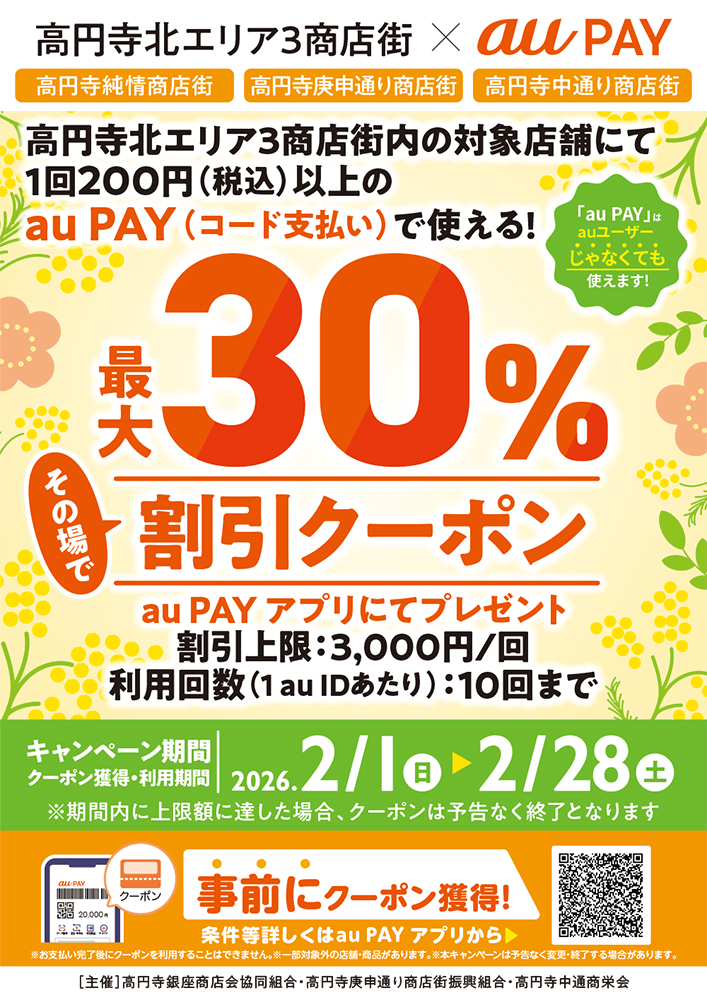 高円寺北エリア3商店街内の対象店舗にて、1回200円(税込)以上のau PAY(コード支払い)で使える! その場で最大30%割引クーポンをau PAYアプリに...more
